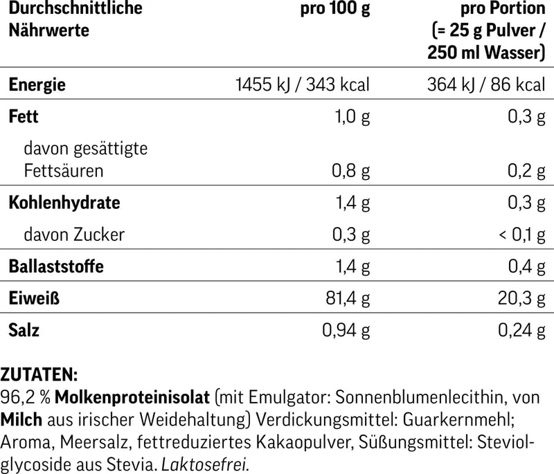 Unser Whey Isolat besteht aus hochwertigem Molkenproteinisolat aus irischer Weidehaltung. Sonnenblumenlecithin fungiert als natürlicher Emulgator. Die Geschmacksvarianten sind nur dezent mit Stevia gesüßt.